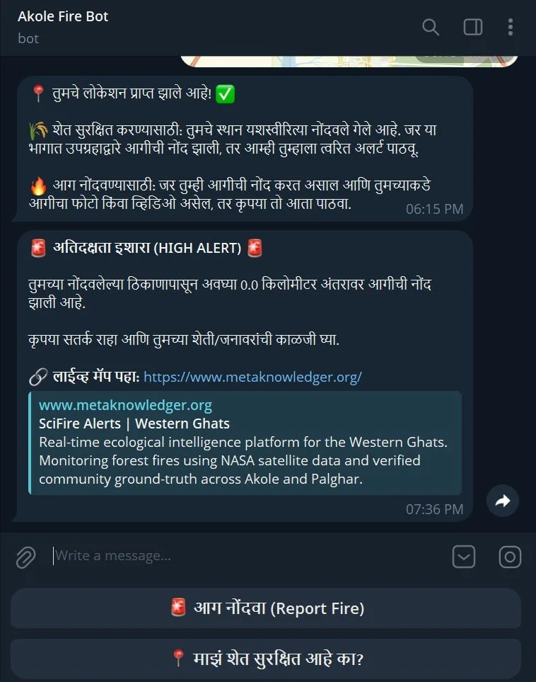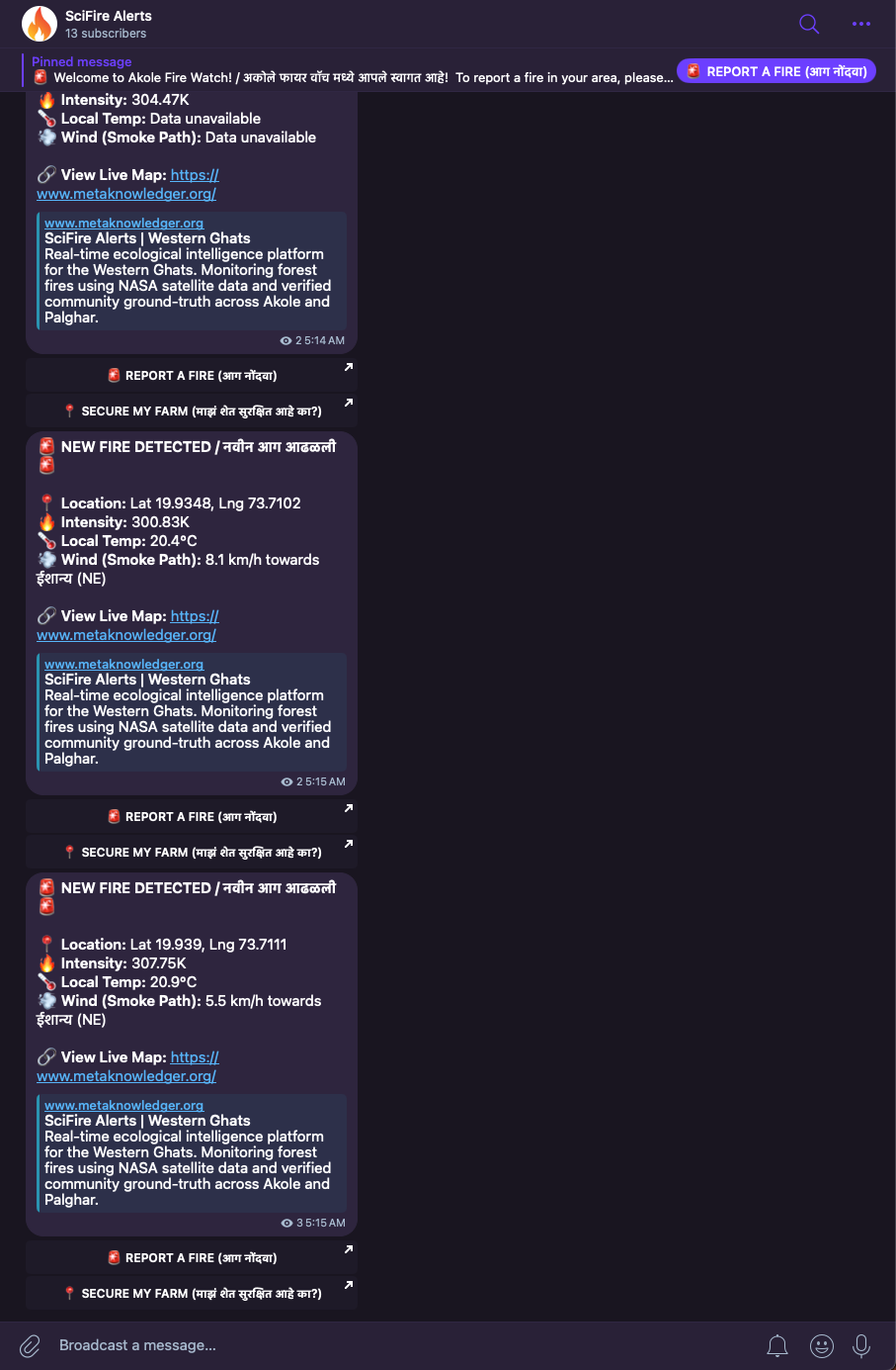 We recognized that farmers working in the fields don't have time to constantly refresh a web dashboard. We needed to bring the alerts directly to them. Locals can now mark their farm's location using our integrated Telegram bot at @scifirealerts.
