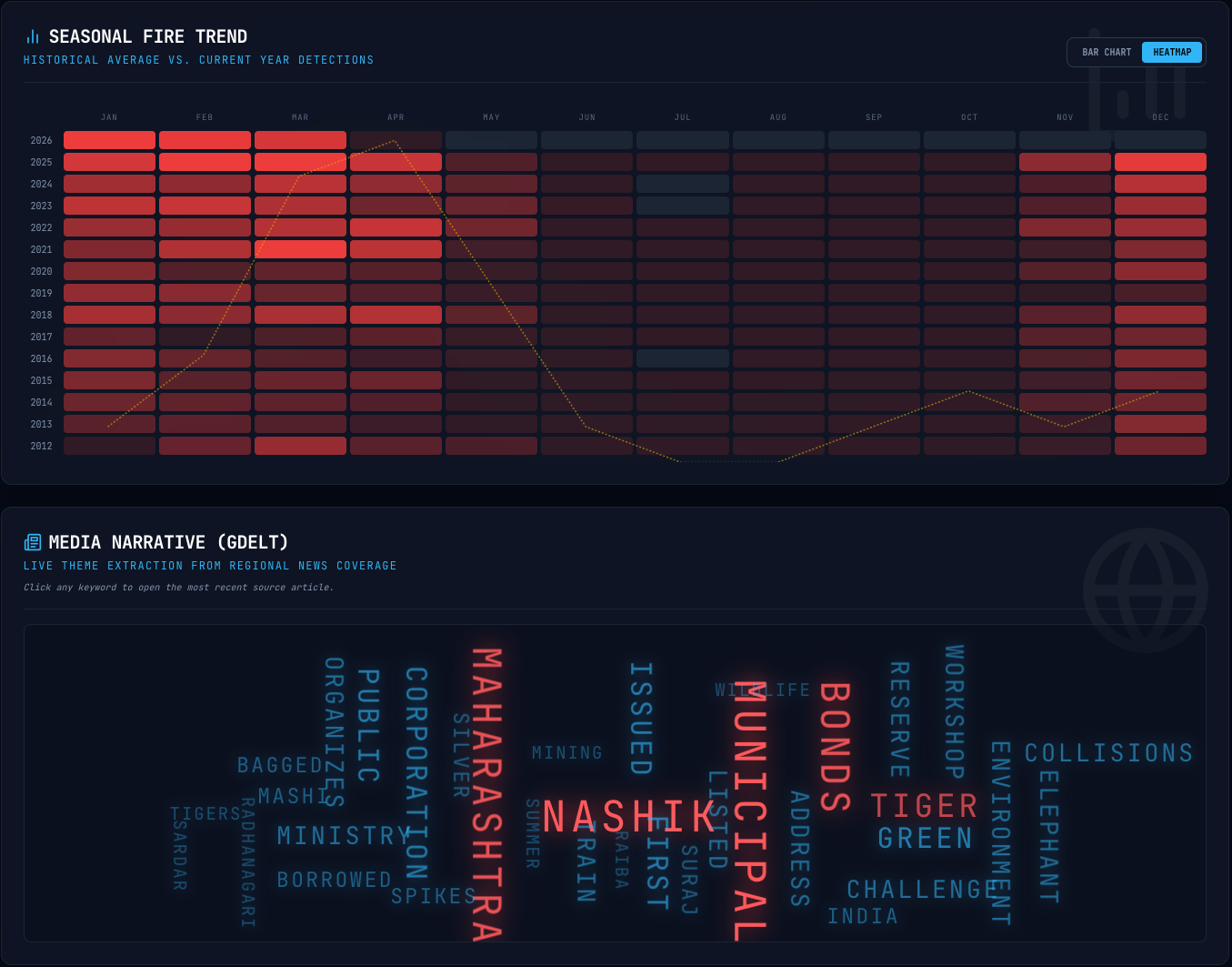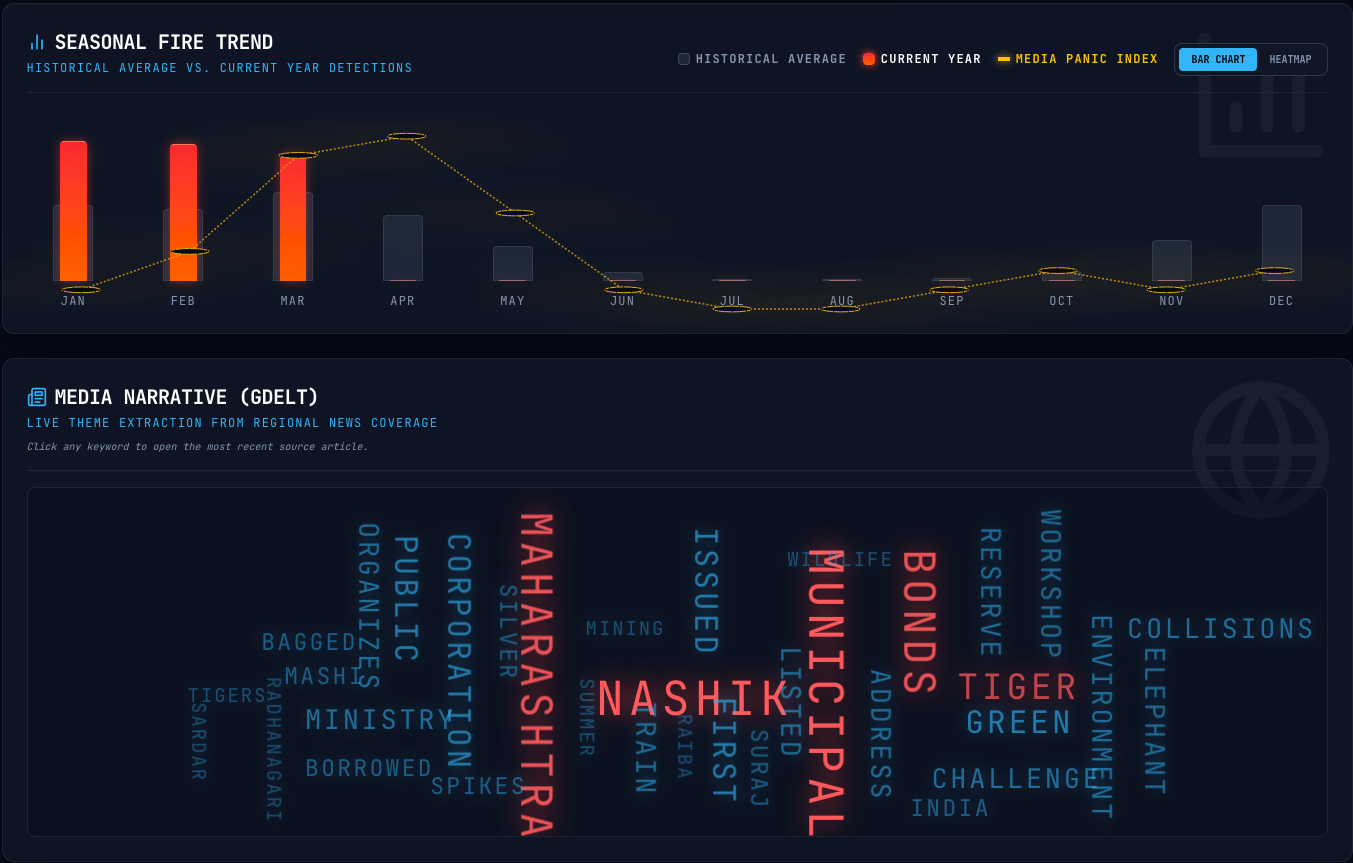 Fires are not just ecological events; they are socio-economic crises. To capture the human impact, we integrated the GDELT Project (Global Database of Events, Language, and Tone). Our system continuously scrapes regional news coverage, extracting live themes and sentiment.